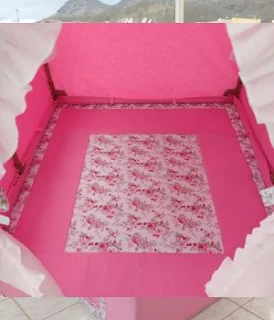 Sempre utilizamos um tecido liso e um estampado (geralmente no telhado) com cores e padrões que combinam. Como por exemplo: cor predominante "rosa".
